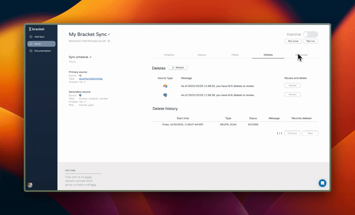 By default, all new syncs have a manual delete policy. If deletes to the data source are supported, you can review these deletes at any time by navigating to the “Deletes” tab. Once there, you can see the history of delete scans and delete executions. You can initiate a new delete scan by clicking “Refresh,” then manually review deletes from both synced sources. If you choose to leave the records in the paired data source, Bracket will no longer give you the option to delete the record in the future. If you decide you’d like to delete it later, you’ll need to do so directly in the data source.